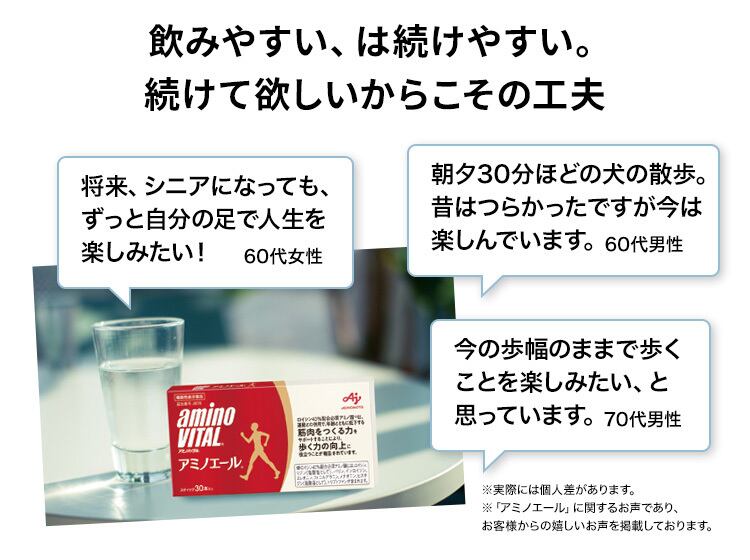 本品にはロイシン40%配合必須アミノ酸※が含まれます。ロイシン40%配合必須アミノ酸※は、運動との併用で、年齢とともに低下する筋肉をつくる力をサポートすることにより、歩く力の向上に役立つことが報告されています。